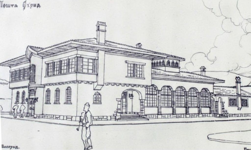 Од истиот период можеме да го анализираме и проектот за поштата во Охрид од 1946 година, кој претставува добар пример за спојот на фолклоризмот и националната архитектура со цел приближување на архитектурата до народните маси. Овој објект ја изразува потребата на новата архитектура да се вклопи во амбиентот и да го продолжи оживувањето на фолклористичкото наследство, развиено во предвоениот период. Структурата на поштата е налик на градските куќи во Охрид.