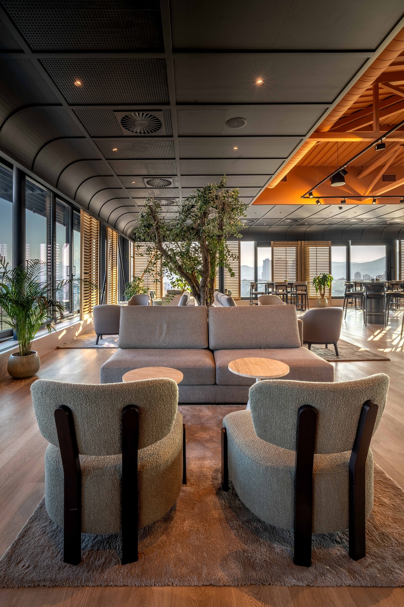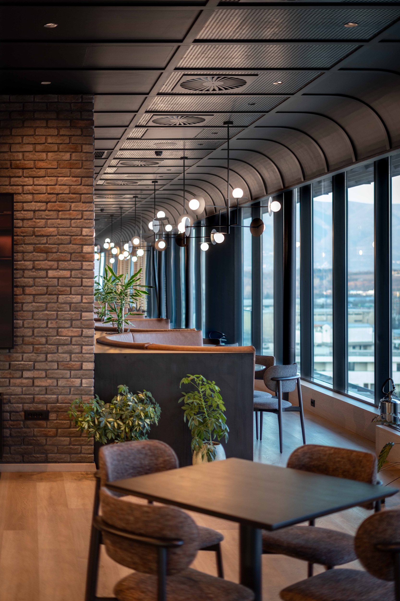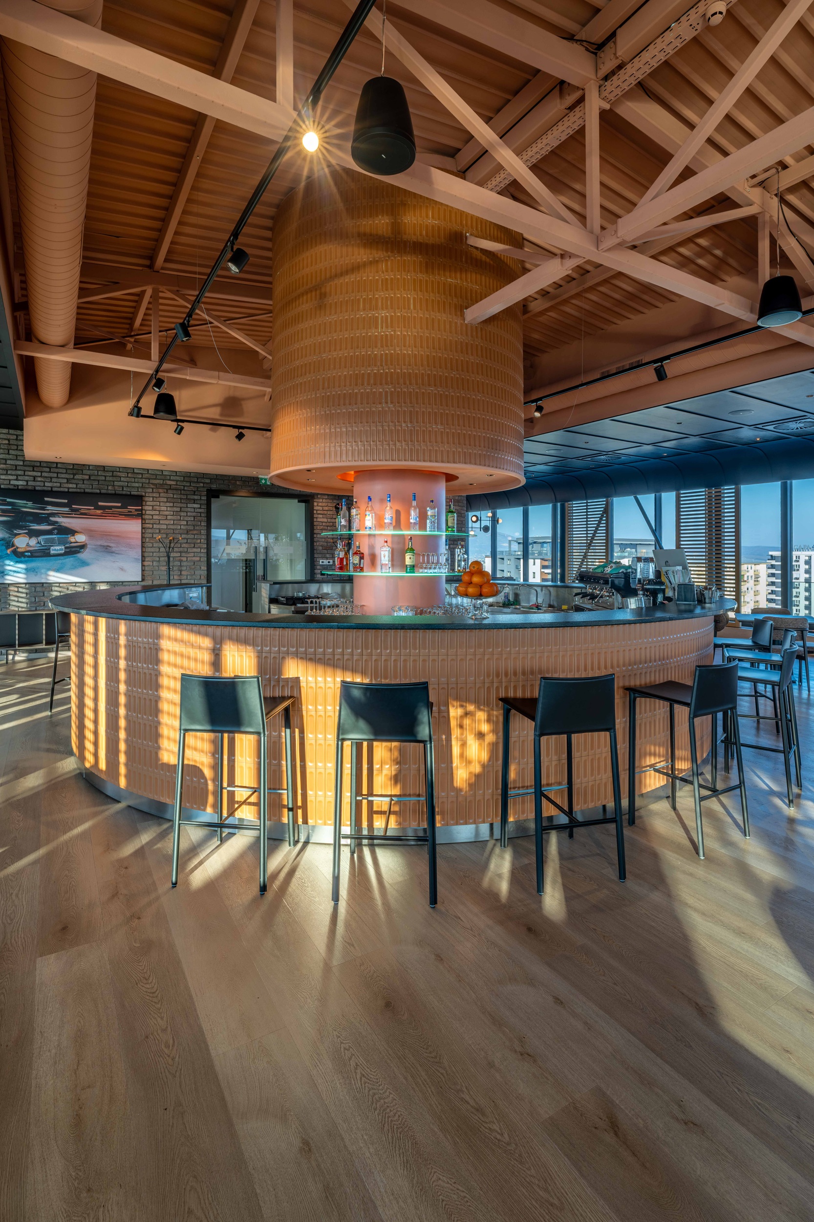 Отворениот внатрешен простор овозможува лесна флуидност во движењето. Средишниот дел е истакнат со големиот кружен пулт во контрастна боја во однос на останатиот простор и овозможува слободно движење и седење околу наоколу. Над него дополнително се истакнува плафонот каде комплетно е видлива кровната конструкција на објектот кој додава на уникатност на дизајнот.