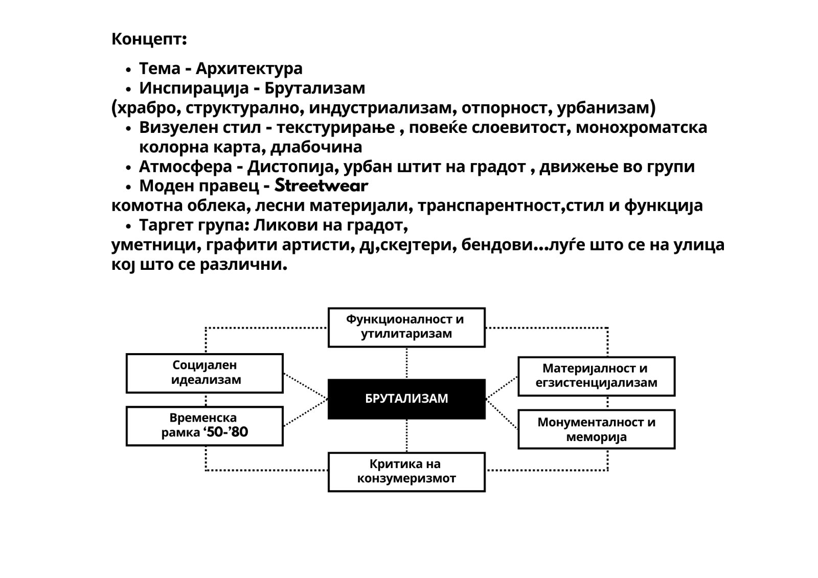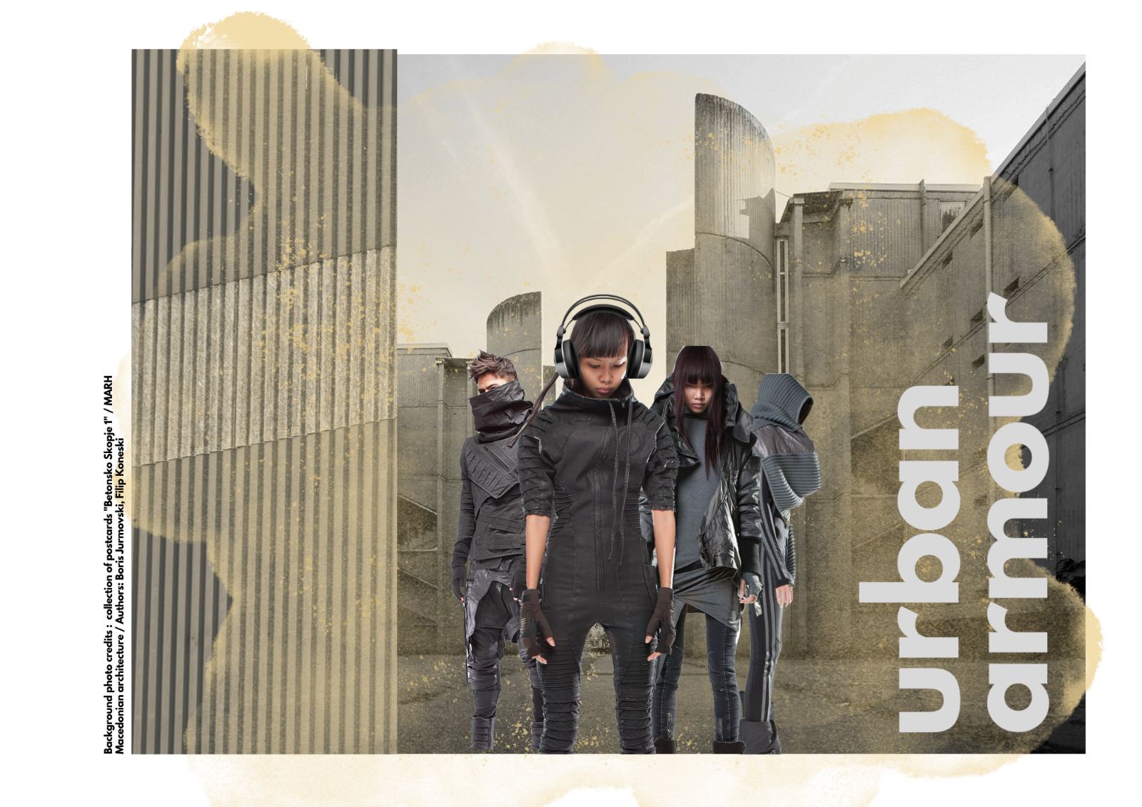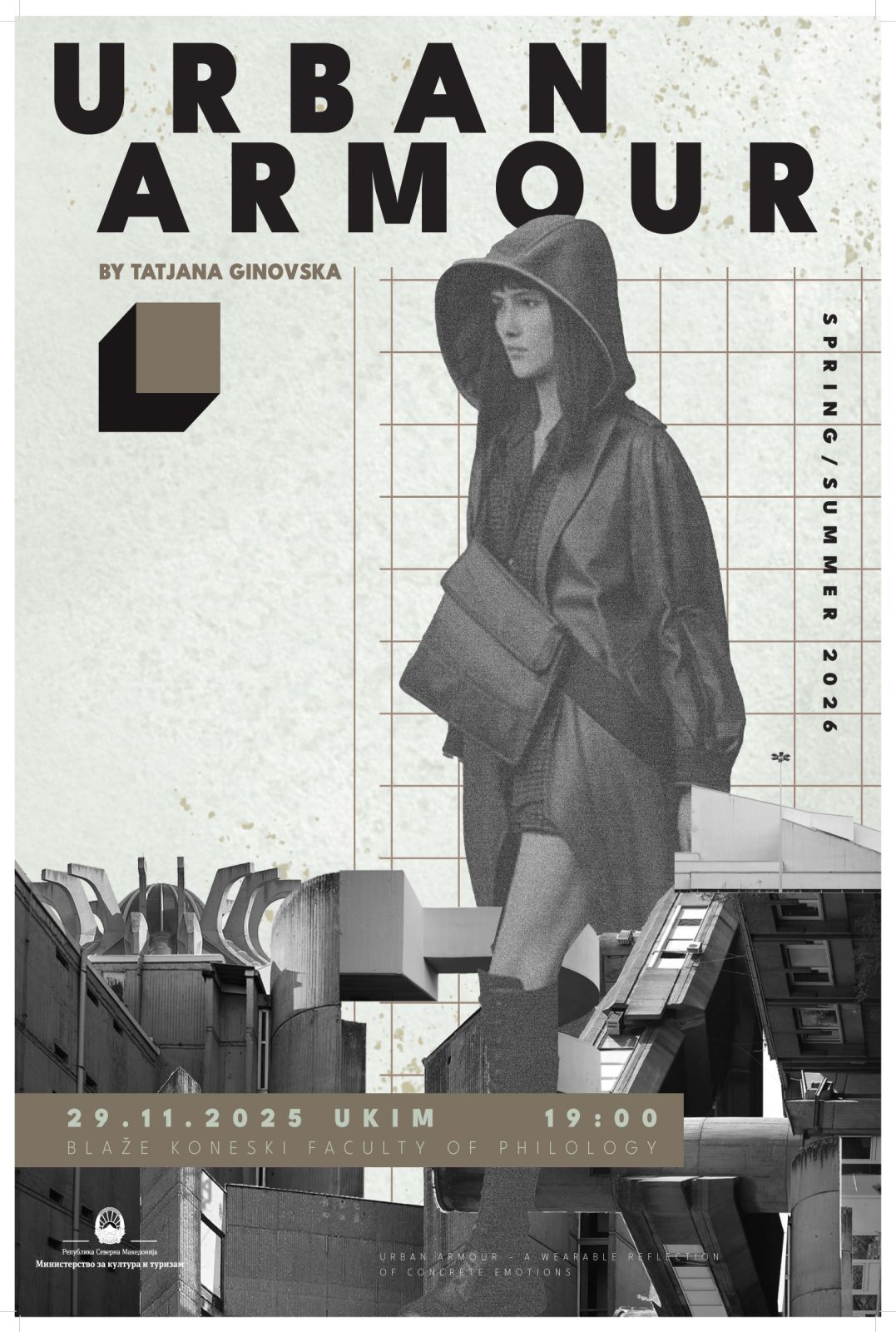 „Urban Armour“ е моден проект кој ја истражува синергијата помеѓу урбаната архитектура, брутализмот и индивидуалниот стил. Проектот го претвора градскиот пејзаж во инспирација за облека, сценографија и визуелни приказни, создавајќи мост помеѓу архитектонските форми и модната експресија. Работен во тим со искусни професионалци за да се пренесеме визијата на публиката: да инспирираме самодоверба, креативност и разбирање на урбаната естетика како дел од современиот културен дијалог.