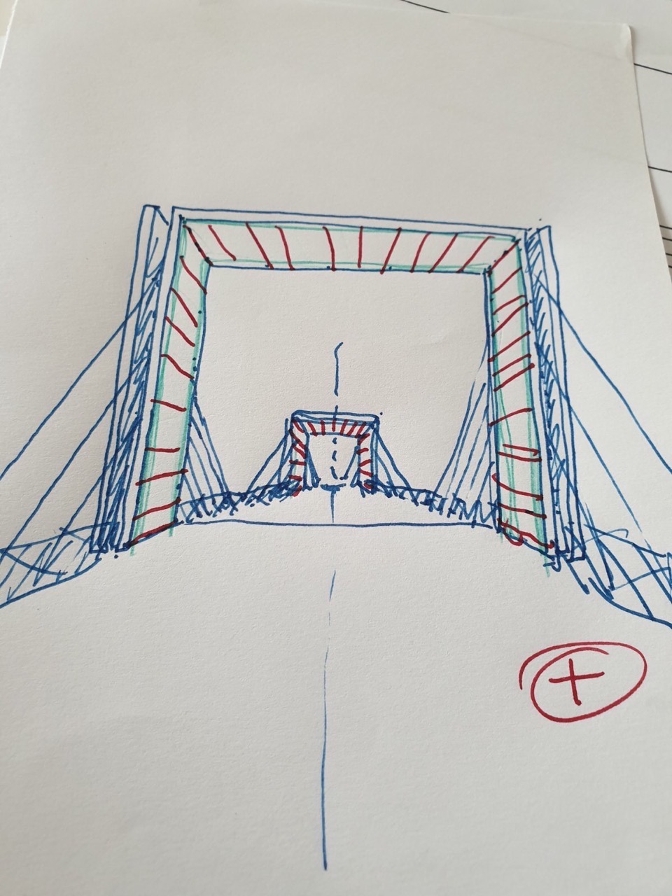 Горниот строј е изведен монолитно со едновремено бетонирање врз интегрирана скела која го премостува минор користото на реката. Поради тоа, при анализа на фазите на градењето земено е предвид постепеното активирање на сопствената тежина на горниот строј поради негово одвојување од скелата во процесот на затегнувањето на косите кабли.