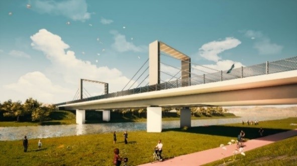 Мостот е проектиран како “extradosed” што претставува хибридно решение помеѓу класичен греден мост и мост со коси кабли. Тој се протега на вкупна должина од 111m преку три полиња (27.5+56+27.5m) и има ширина од 24.1m (4 сообраќајни ленти, две пешачки и две велосипедски патеки).
