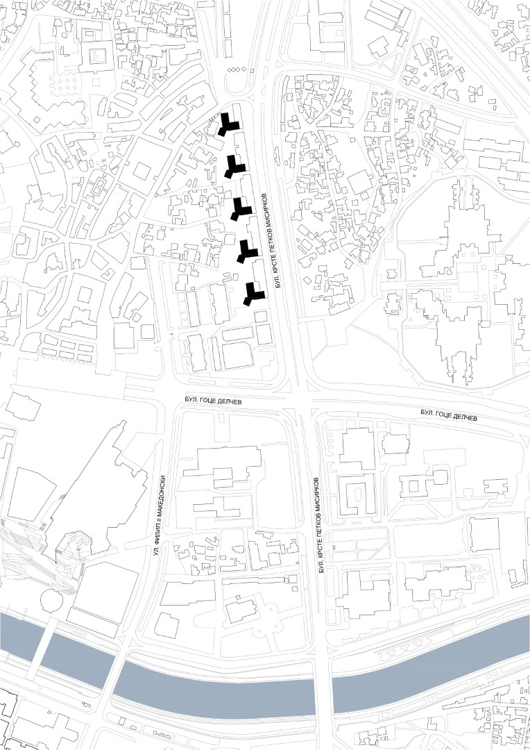 Петте станбени објекти проектирани од архитектот и урбанист Драган Томовски се наоѓаат помеѓу денешниот Битпазар, Скопската чаршија и Деловно трговскиот центар Мавровка, од западната страна на булеварот Крсте Петков Мисирков. Булеварот на кој се наоѓаат објектите е самиот по себе е од голема историска важност. Претставува првата оска која внесува дијаголанен правец во историското јадро на градот Скопје поврзувајќи го Бит Пазар со Железниот мост на „Мехмет Шефќет Паша“ подигнат 1905 година.