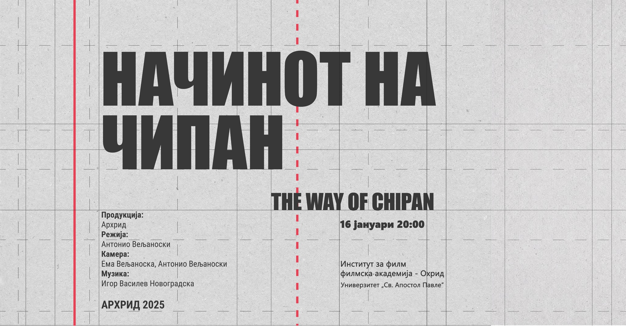 16ти јануари, петок 20:00, во ФИОФА (Универзитет Св. Апостол Павле) ќе биде прикажан филмот „Начинот на Чипан“.