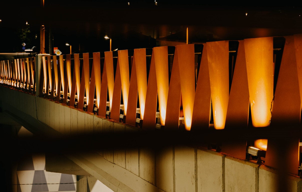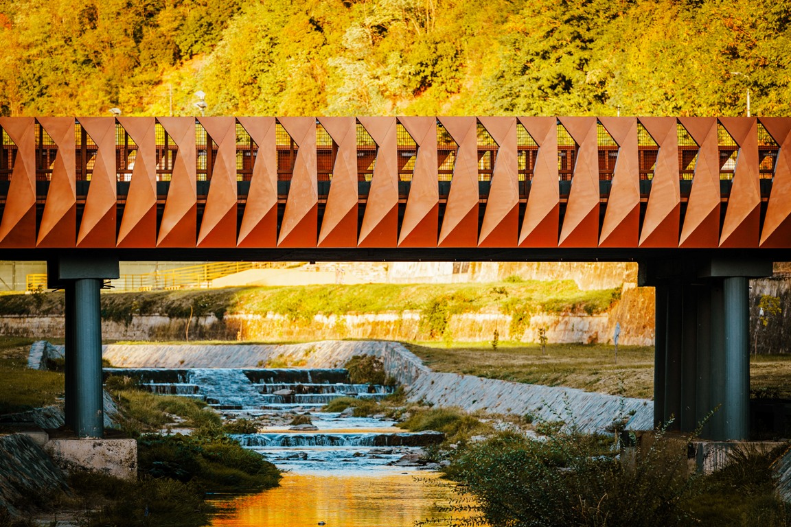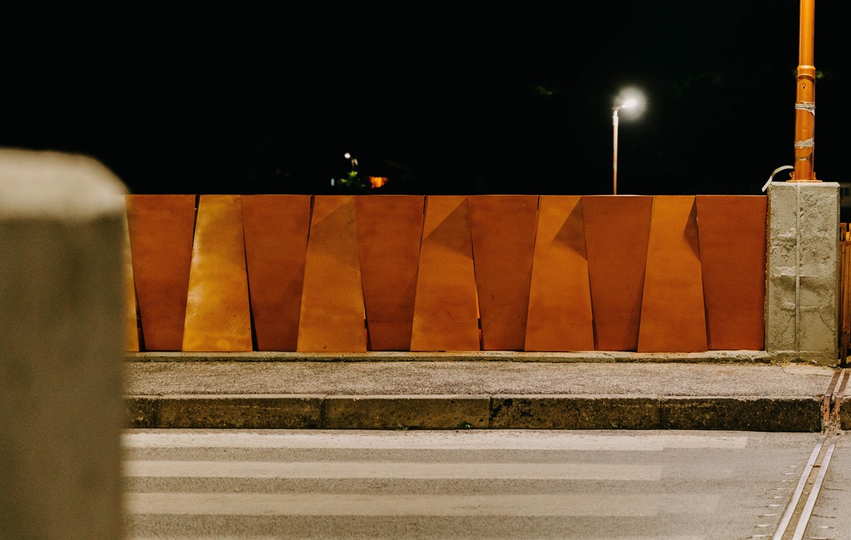 Редизајнот на Осичкиот мост воведува ново ниво на комуникација помеѓу речното корито и урбаното ткаење. Оградата е изработена од ритмички поставени метални панели со кои се создава динамична игра на светло и сенки. Панелот е изработен од едно парче лим со принцип на превиткување – оригами од кои се создава архитектонска структура која го претставува движењето, трансформацијата и дијалогот со иднината на градот.