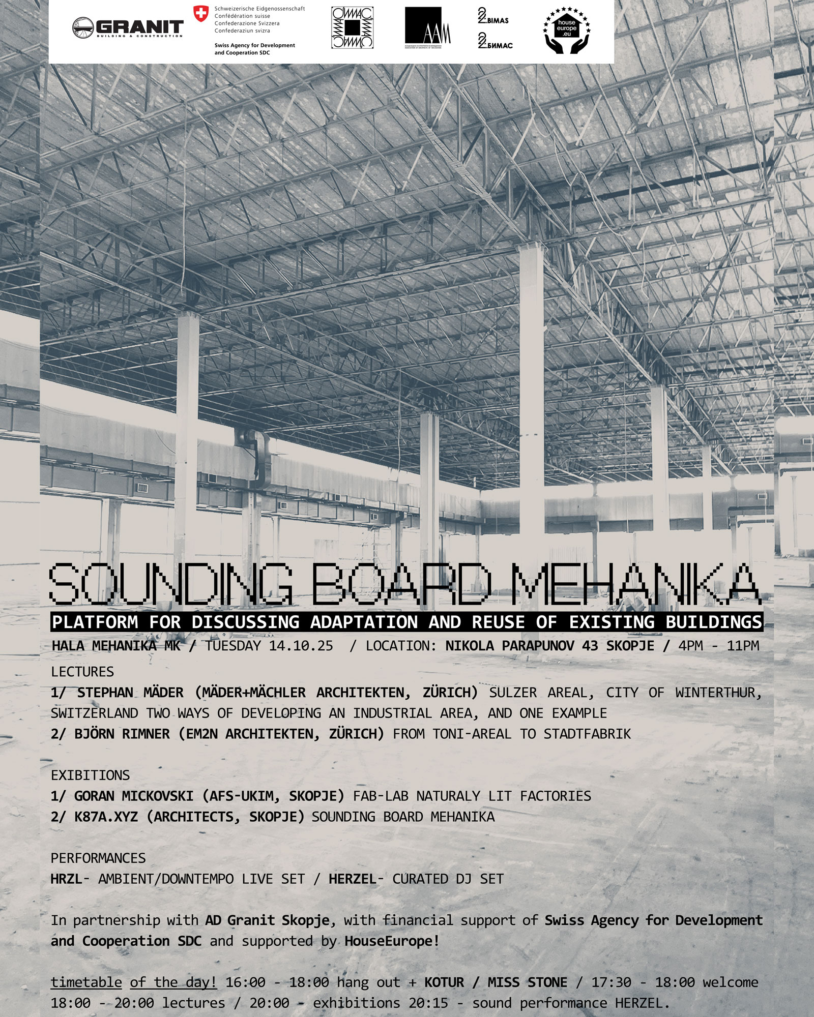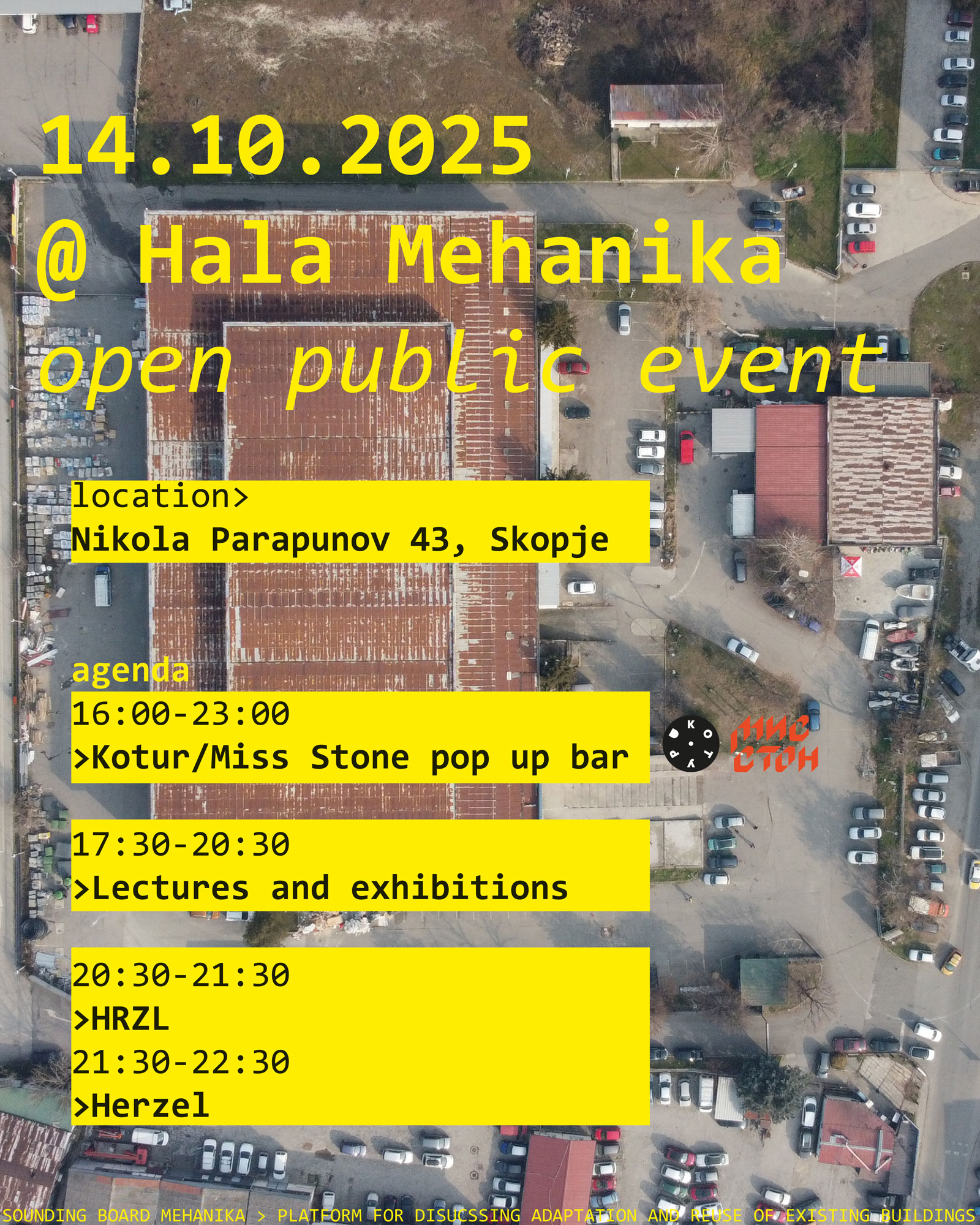 Настанот е насловен “SOUNDING BOARD MEHANIKA” и ќе се одвива во вторник на 14.10.2025. Темите на настанот се: трансформација на стари индустриски комплекси, реискористување и вреднување на постоечките квалитети како и генерирање на културна инфраструктура. Целта на настанот е информирање на јавноста со процесите при ваков тип на проекти како и запознавање со капацитетите на халата. Идејата е отворен и холистички пристап во процесот на проектирање, со цел генерирање на простор со јавен и културен карактер.