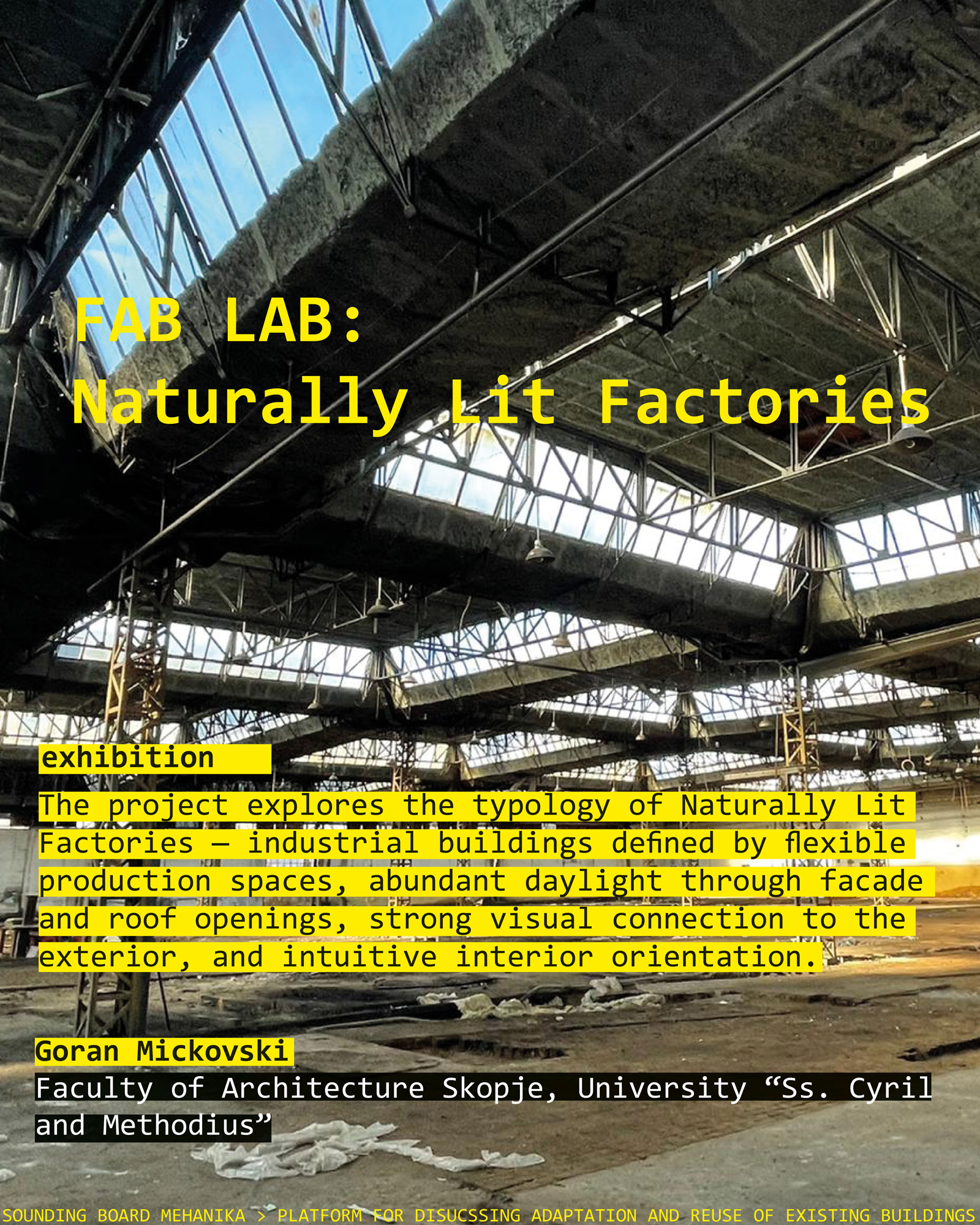 Проф. Д-р. Горан Мицковски од Архитектонскиот факултет при УКИМ, Скопје се фокусира на индустриската архитектура, трансформацијата на индустриското наследство и современите индустриски типологии. Неговата изложба ги истражува фабричките хали со природно осветлување и нивниот потенцијал за современа архитектонска интерпретација.