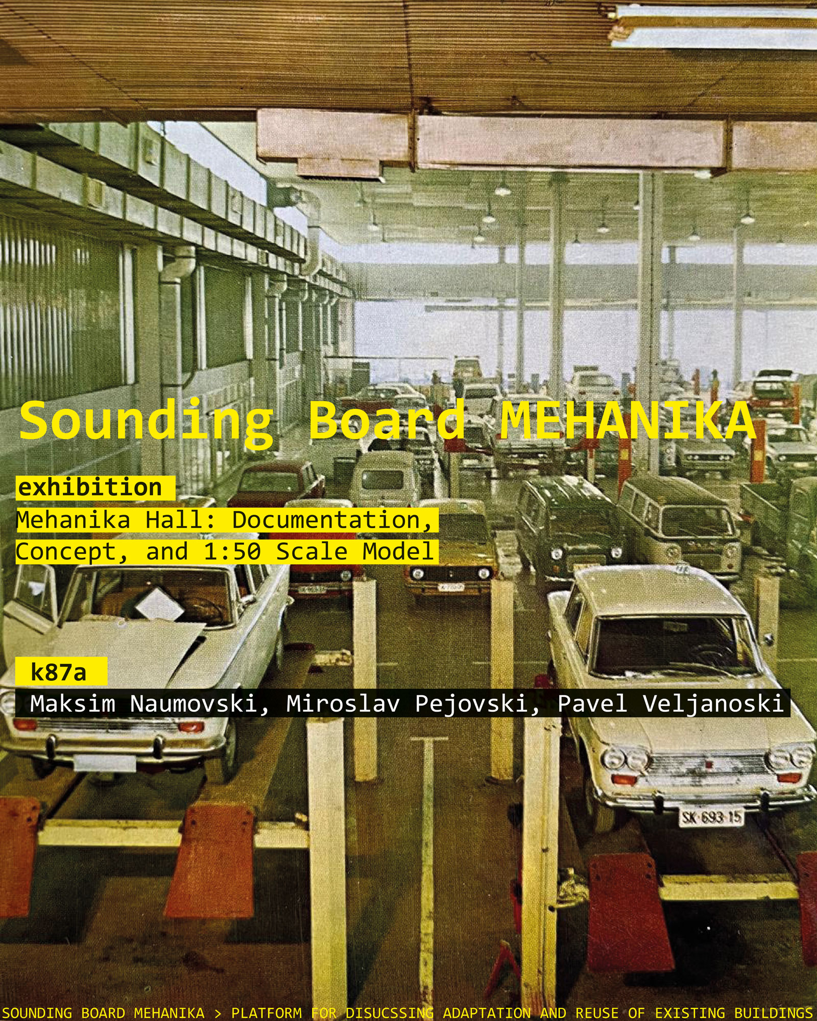 к87а, архитектонско биро од Скопје составено од Максим Наумовски, Мирослав Пејовски и Павел Велјановски, ќе претстави инсталација инспирирана од темата на настанот. Студиото комбинира практична работа и академско истражување, при што пристапот се заснова на аналитичко разбирање на постоечките услови и развивање на јасни просторни и конструктивни системи кои одговараат на контекстот. Со Sounding Board Mehanika, тие ја претвораат самата хала во експонат — жив пример за повторна употреба на индустриски простор.